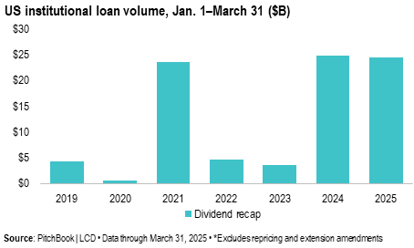Sponsors remain active in extracting dividends despite a challenging exit environment. Q1 new-issue volume for dividend recapitalizations reached $24.4 billion, a slight decrease from last year’s first quarter volume of $24.8 billion.