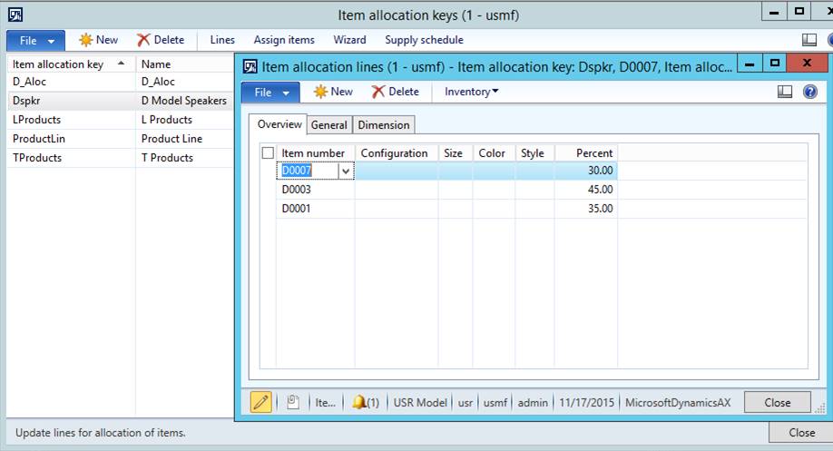 The Item Allocation Lines form allows the user to define the items, any dimensions that are required, and the Percentage for each of the family members that make up the total.
