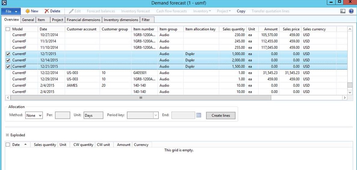 Demand Forecast lines for Item Allocation Keys can be manually created in this form. Note that this form requires either an Item Number or an Item Group. To enter lines for Item Allocation Keys, an Item Group is required, but when the Item Allocation Key is entered, the system will ignore the Item Group. The quantity entered in the ‘Sales Quantity’ field will be exploded through the members of the family, multiplied times the percentage entered for each member.
