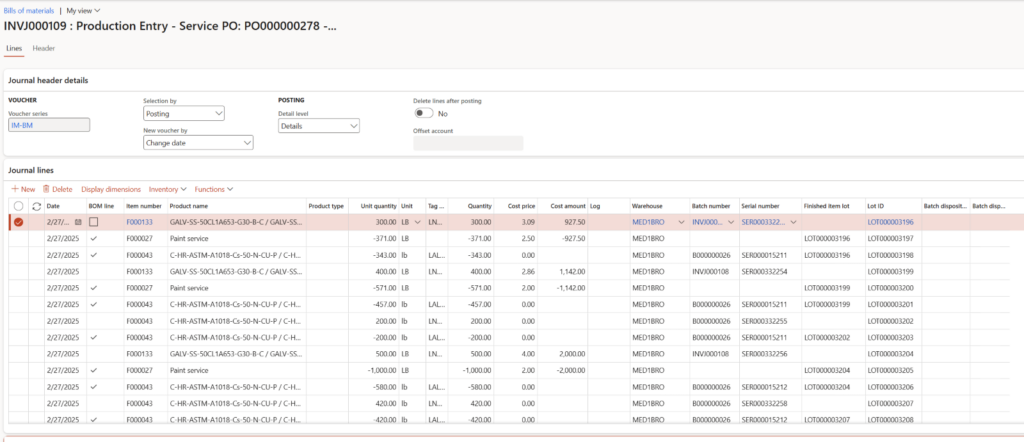 The user can then post the BOM journal, which will then add the children coils to inventory as well as the parent items deduction with all associated GL and cost apportionment from parent to child allocated.